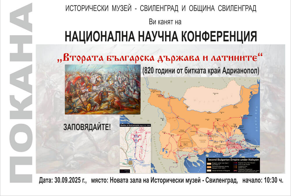 Национална научна конференция „Втората българска държава и латините“ организира на 30 септември Историческият музей в Свиленград. Форумът, който ще се състои в новата музейна зала, отбелязва 820 години от историческата битка при Адрианопол в близост до крепостта Букелон. Проф. д-р Пламен Павлов ще изнесе доклад на тема „Щрихи към политическия портрет на цар Калоян“, водил…